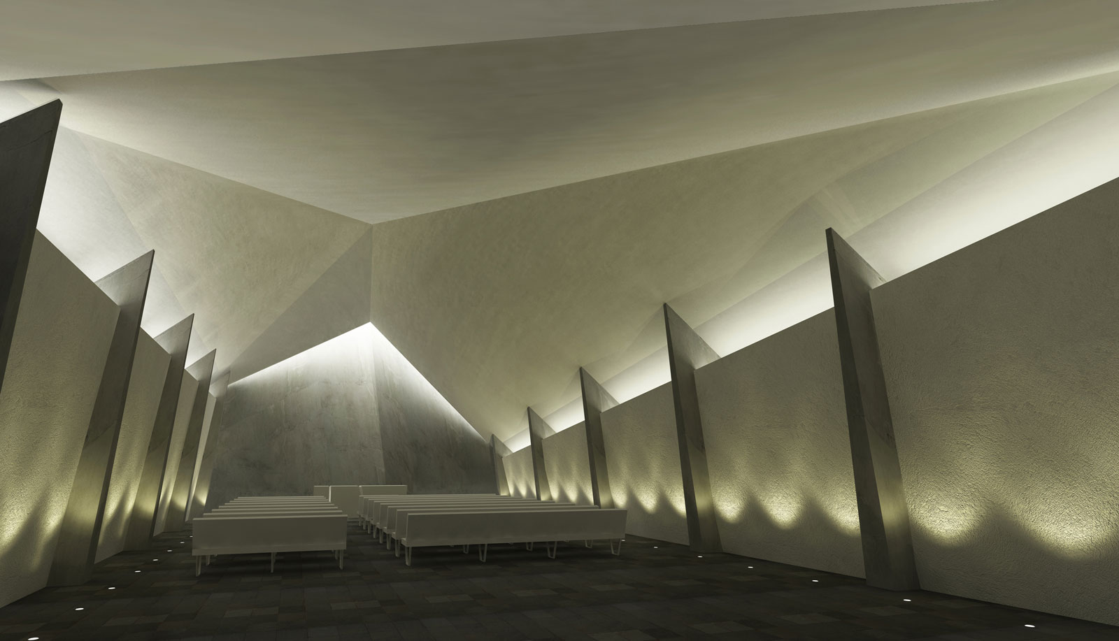 Inspired by paper crane which means blessings to the death, the project is to design a folding roof standing out from the surrounding environment in order to initiate people's emotions. The shape of the exterior does, however, give away the variety of structural distributions within the interior spaces. Here, the areas are divided by folding ceiling's nature, different floor levels and types of light instead of walls.
